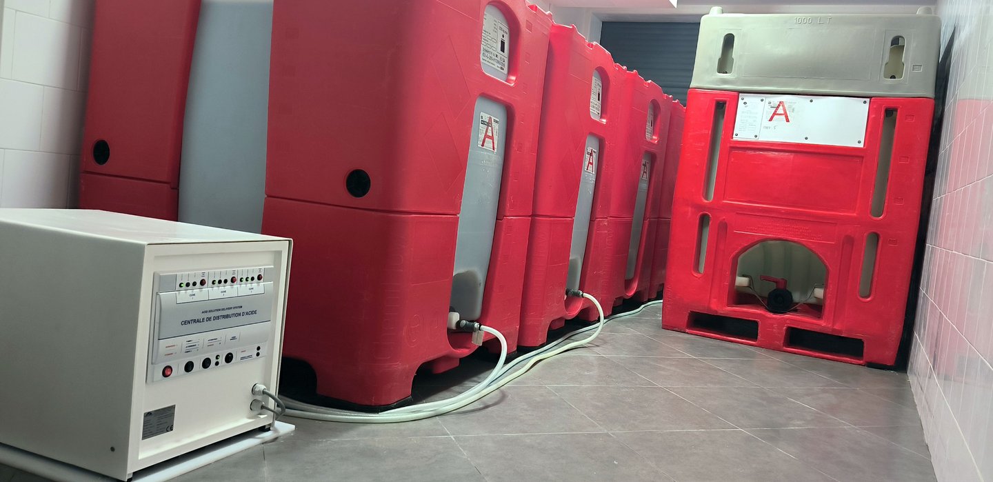 Lors de la conception du nouveau centre d’hémodialyse, nous sommes d’ores et déjà inscrits dans une démarche qualité afin d’améliorer la qualité des soins de nos patients, améliorer le quotidien du personnel de l’environnement. Pour cela nous avons opté pour l’utilisation des bains de dialyse sous forme de concentrés d’acide en cuve vrac de 1000 litres au niveau des salles de dialyse par centrale de distribution qui répond aux normes des standards européens afin de garantir toute la sécurité requise par les normes ISO 13485, ISO 23500 et CE. Ce système innovent a été conçu avec notre partenaire historique SOLUDIA MAGHREB Laboratoire pharmaceutique avec lequel nous travaillons en étroite collaboration depuis plus de 28 ans.